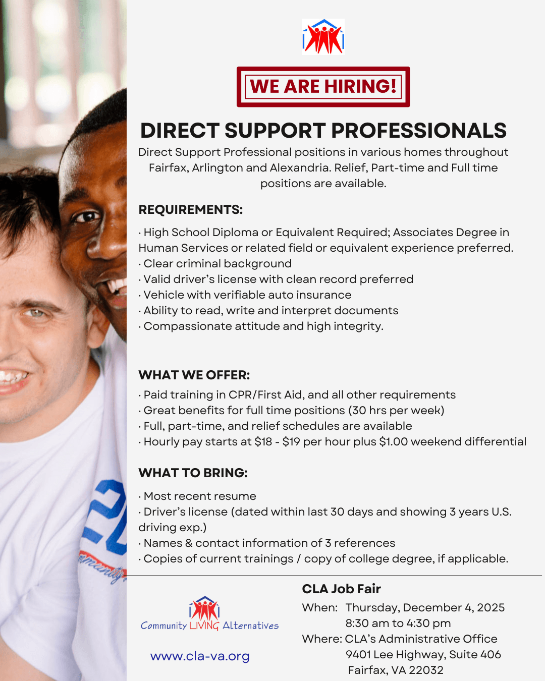 Community Living Alternatives is an equal employment opportunity employer. We adhere to a policy of making employment decisions without regard to race, color, religion, gender (except where sex is a bonafide occupational qualification), sexual orientation, gender identity, marital status, national origin, ethnic origin, military status, citizenship, age or disability. We assure you that your opportunity for employment with CLA depends solely on your qualifications.